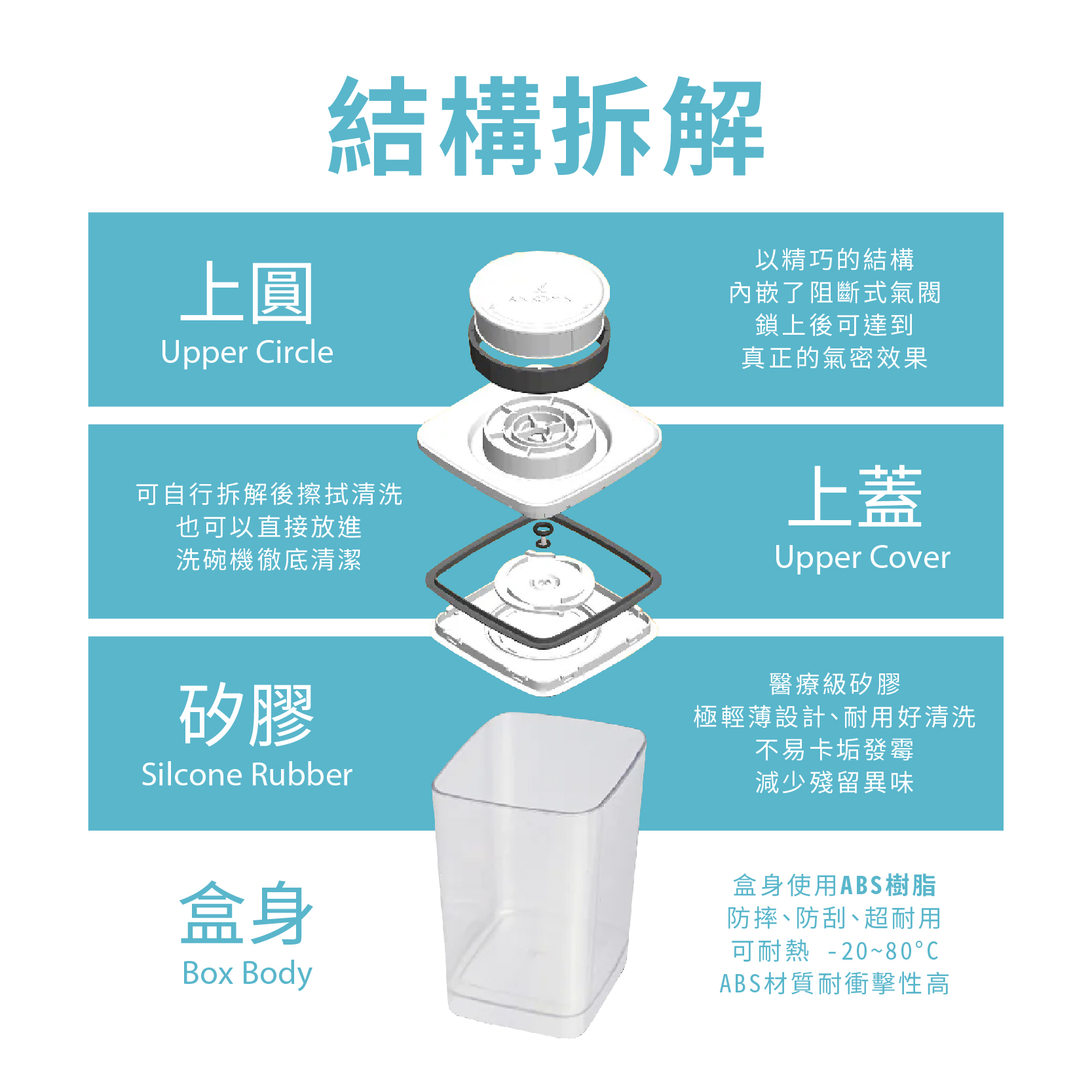 5. 上蓋矽膠片為醫療用矽膠材質,不易脆化與發霉,請安心使用。