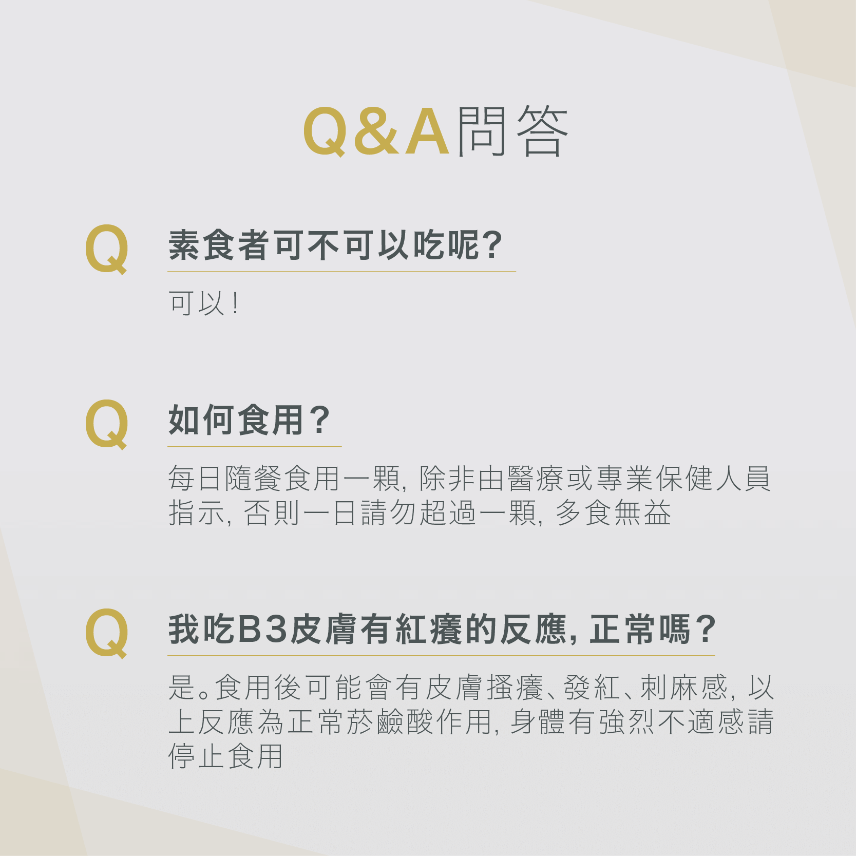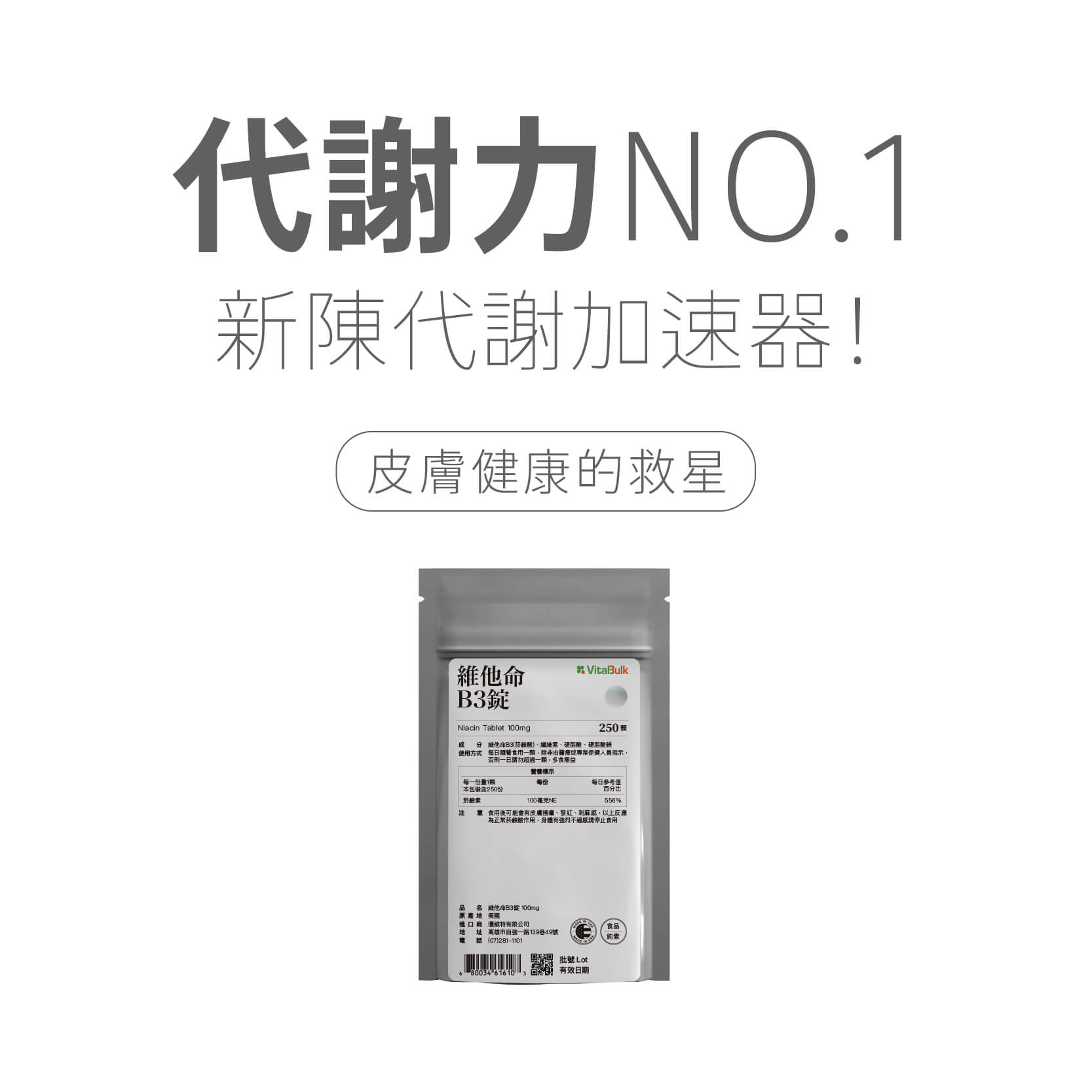 ◆警語:食用後可能會有皮膚搔癢、發紅、刺麻感、以上反應為正常菸鹼酸作用、身體有強烈不適感,請停止食用