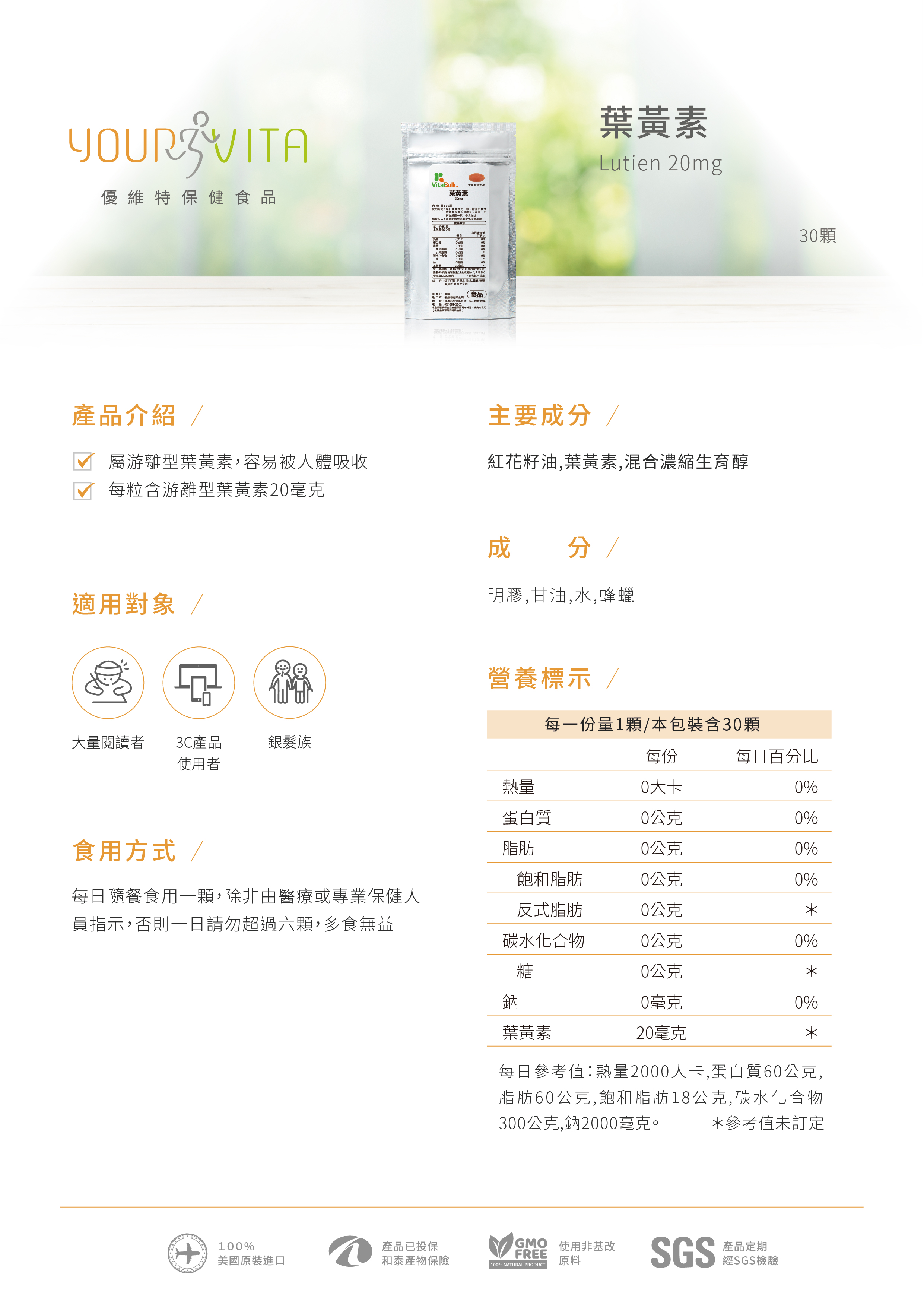 ◆商品名稱:VitalBulk 葉黃素(Lutein) 20mg